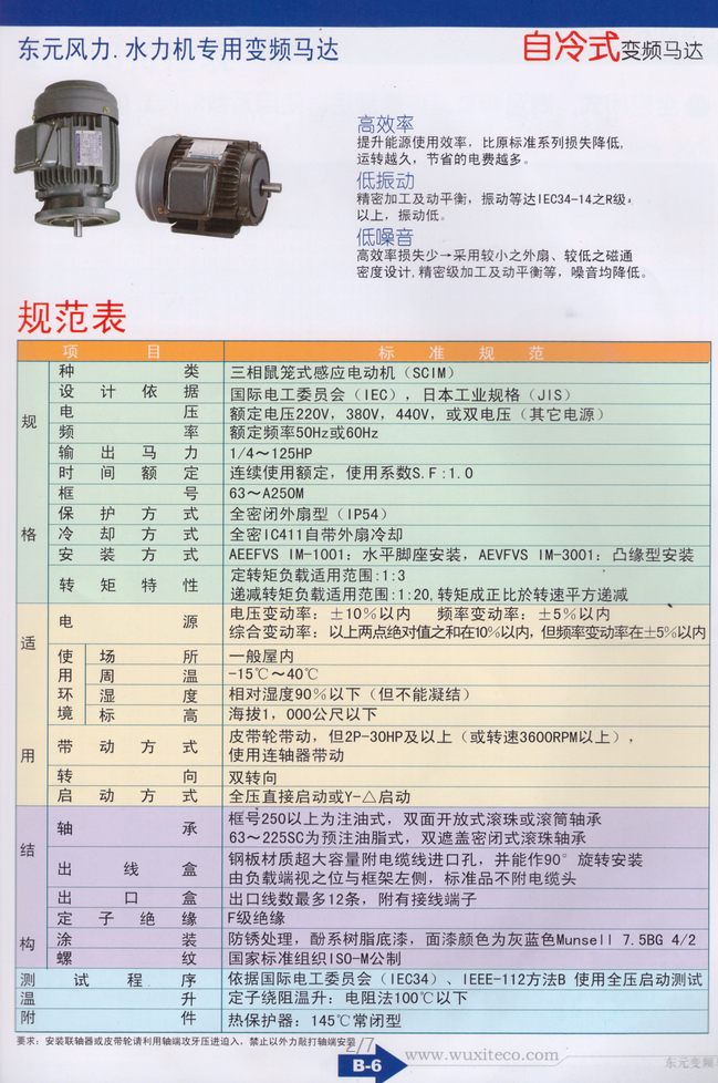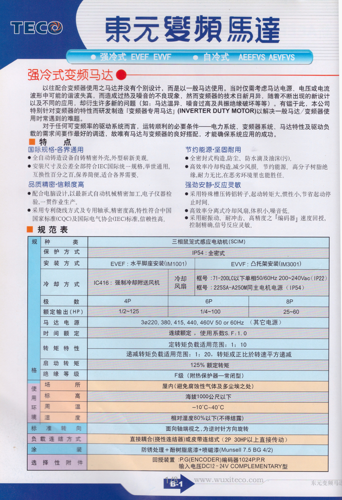 TECO東元變頻電機種類:三相鼠籠式感應電動機 保護方式:IP54:全密式 安裝方式:EVEF 水平腳座安裝(IM1001) EVVF 凸托架安裝(IM3001) 極數:4P 6P 8P 額定輸出:1/2-125 1/4-100 25-60 馬達電源:3#220,380,415,440,460V 50 or 60HZ(其他電源) 時間額定:連續額定,使用系數S.F:1.0 轉矩特性:定轉矩負載適用范圍:1:10 遞減轉矩負載適用范圍:1:20,轉矩成正比與轉平 方遞減 啟動轉矩:125%額定轉矩 絕緣等級:F級(附熱保護器---常閉型) |